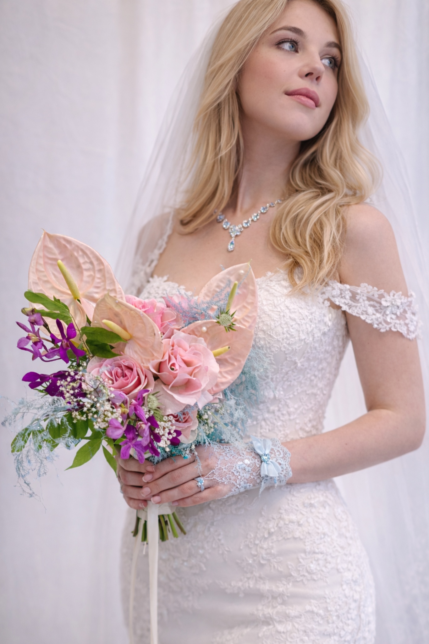 Asymetryczna, nowoczesna forma bukietu ślubnego na podstawie z róż z dodatkiem anturium i storczyka.